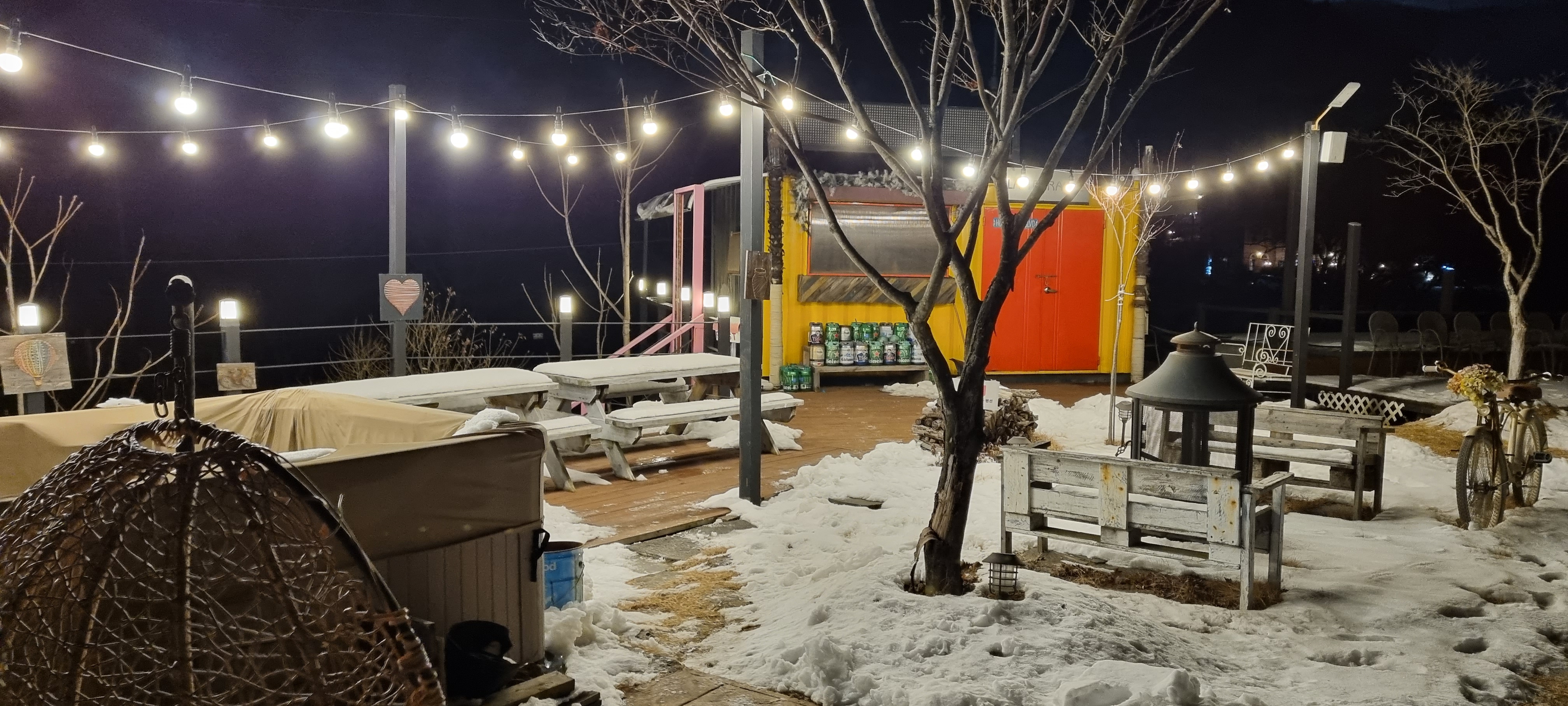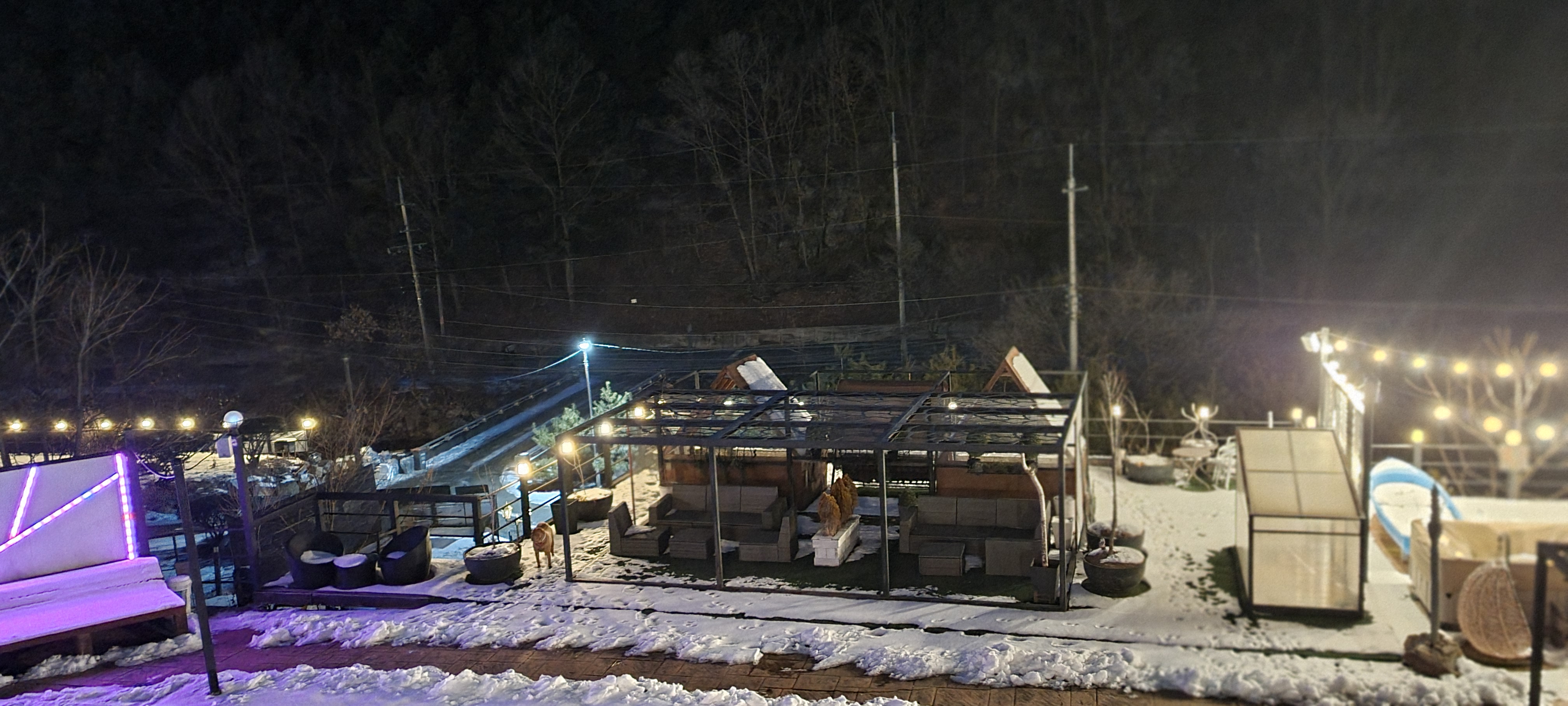 밤이 되니 펜션 주변에 예쁜 조명을 켜 놓아 분위기가 좋다. 아이들 점퍼를 입히고 조명을 배경삼아 사진을 찍어주었다.