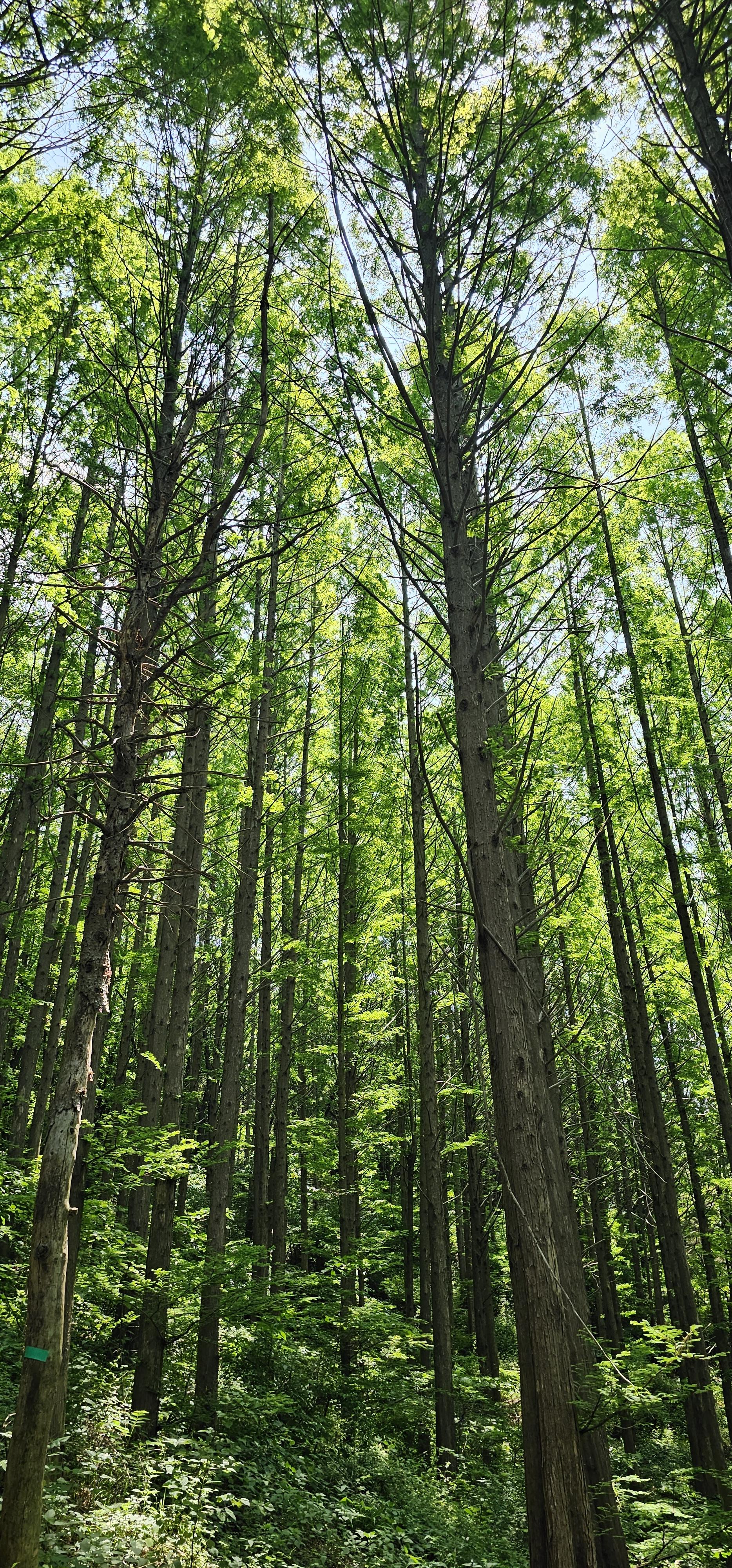 더 아래로 길을 따라 내려갔다. 한 번 더 갈림길이 나와 유튜브를 확인했다. 아래로 내려가면 메타세콰이어 길이 나온다. 구간은 좀 짧지만 그래도 나무가 커서 더 멋지게 보인다.