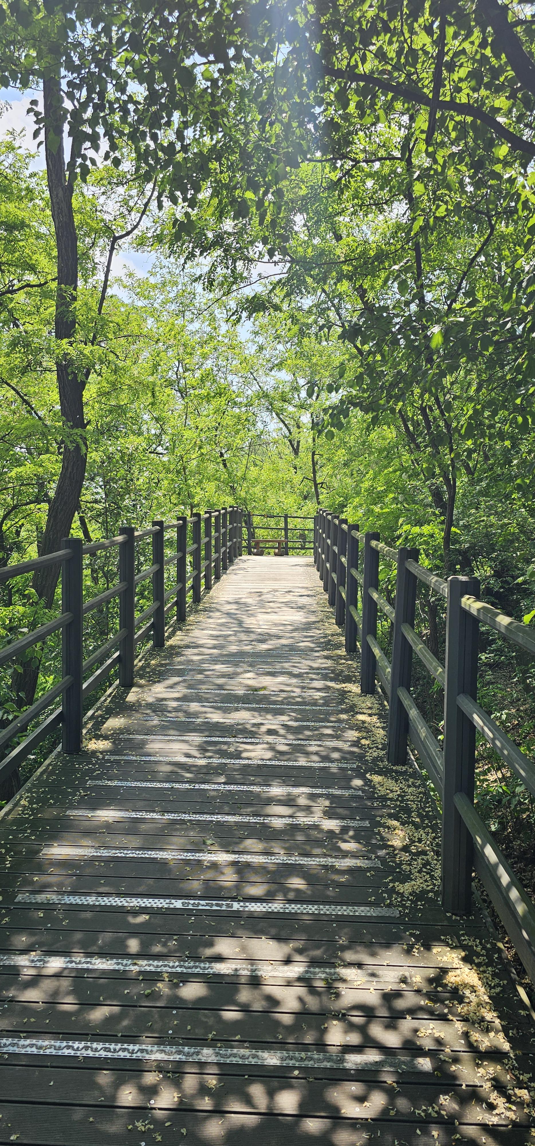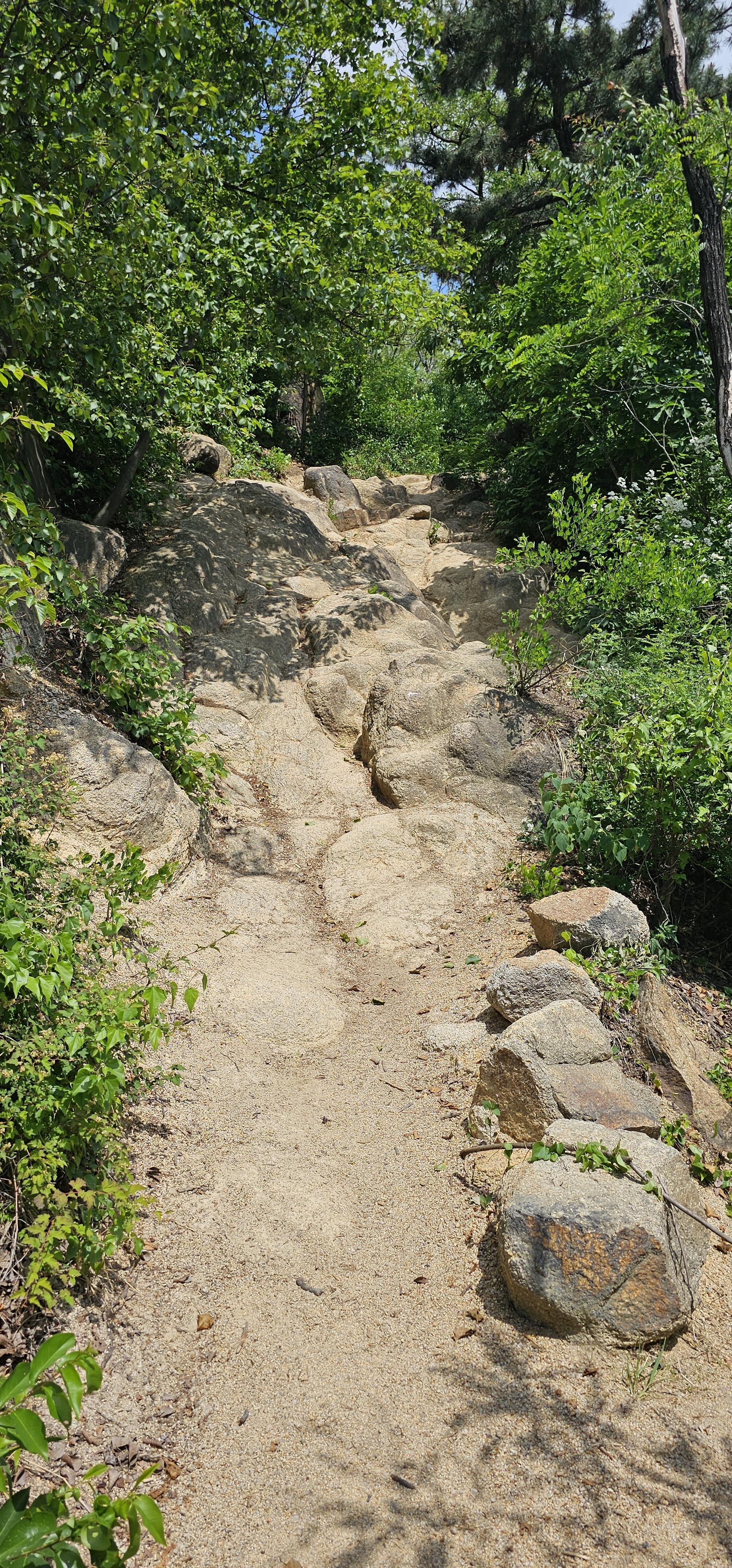 본격적으로 자락길이 시작되었는데 나무 데크길이 잘 되어있어서 걷기도 편하고 나무가 울창해서 그늘을 잘 만들어 주었다. 날씨가 5월이지만 기온이 많이 올라가고 햇빛도 따가워서 그늘이 반갑다. 유튜버의 안내대로 좀 불편하거나 가기 어려운 길은 나무데크가 잘 되어 있고 흙길이 나와도 평평한 길이 대부분이었다.