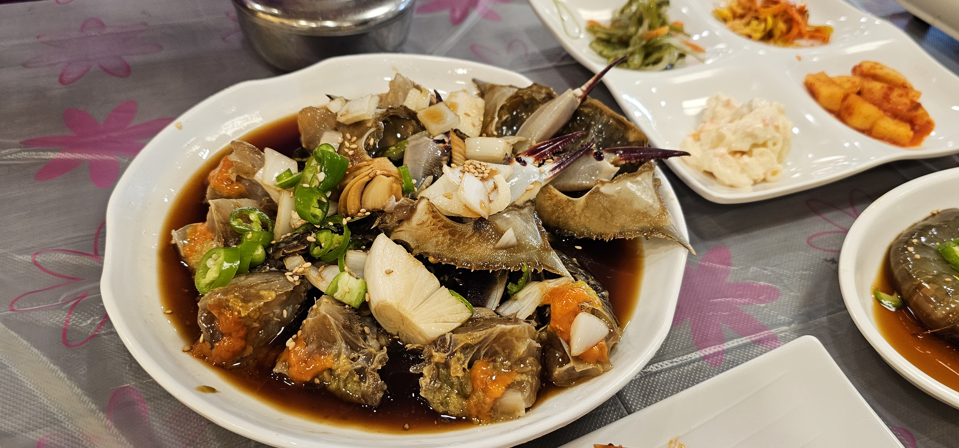 암꽃게 정식 코스요리를 먹었다. 간장게장, 양념게장, 새우장, 크림새우, 꽃게탕 등 푸짐하게 먹었다.
