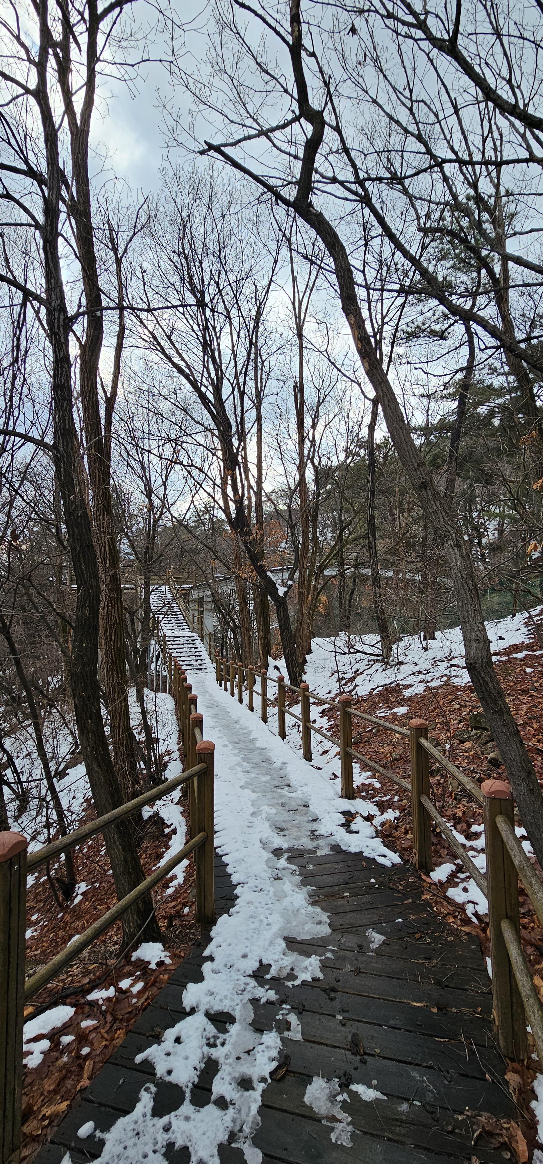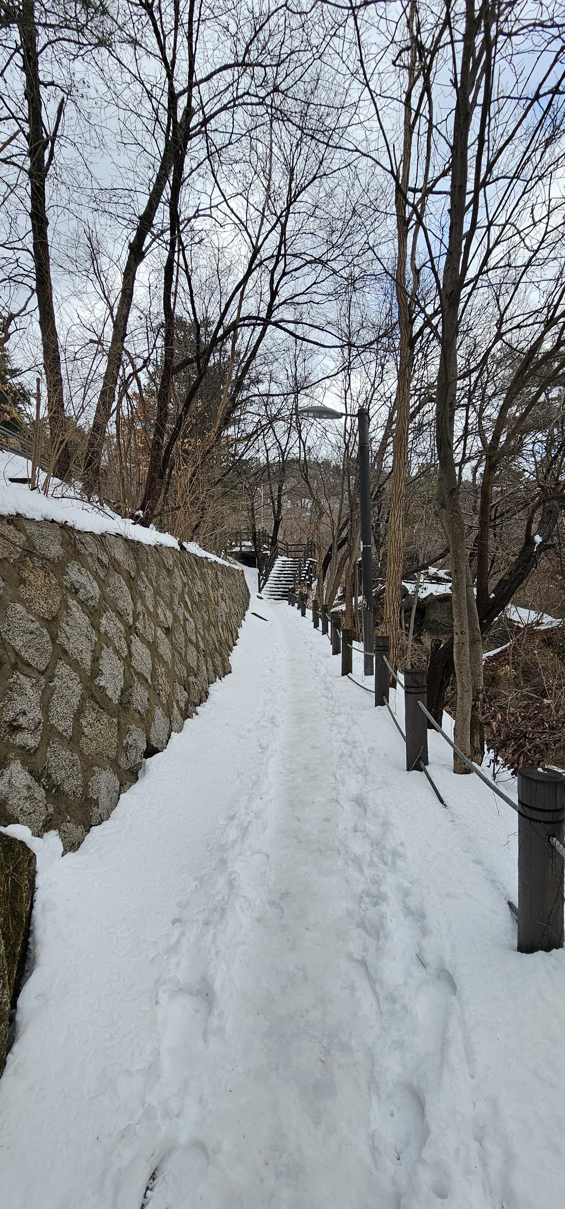 저번 주 눈이 많이 왔었다. 길 대부분은 눈이 녹아있었는데 위쪽으로 올라갈 수록 눈이 쌓여 있어 살짝살짝 미끄러져서 눈길을 걸을때면 발가락에 힘을 주어서 걸었다. 그래도 다행인건 습기가 많은 눈이어서 많이 미끄러지지는 않았다.