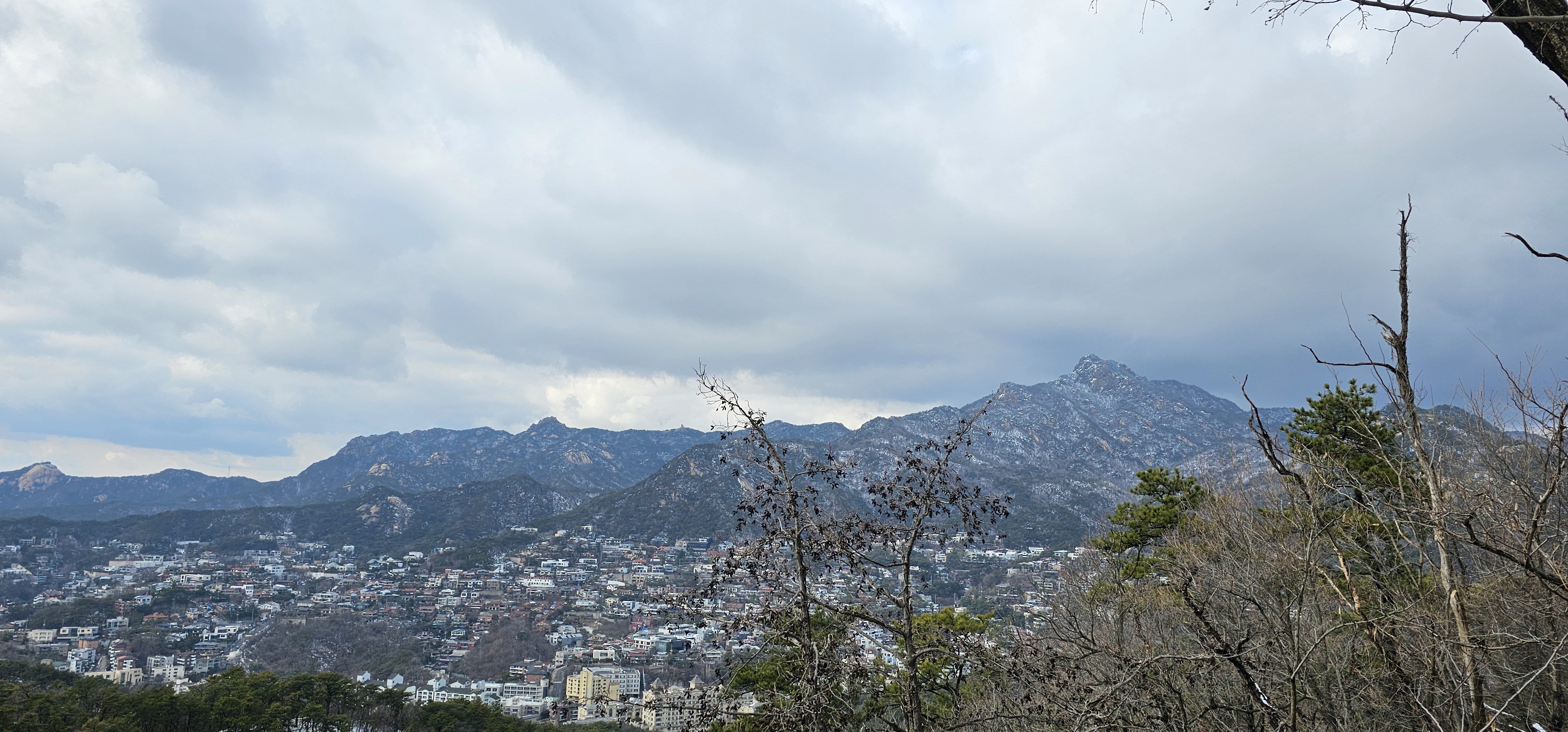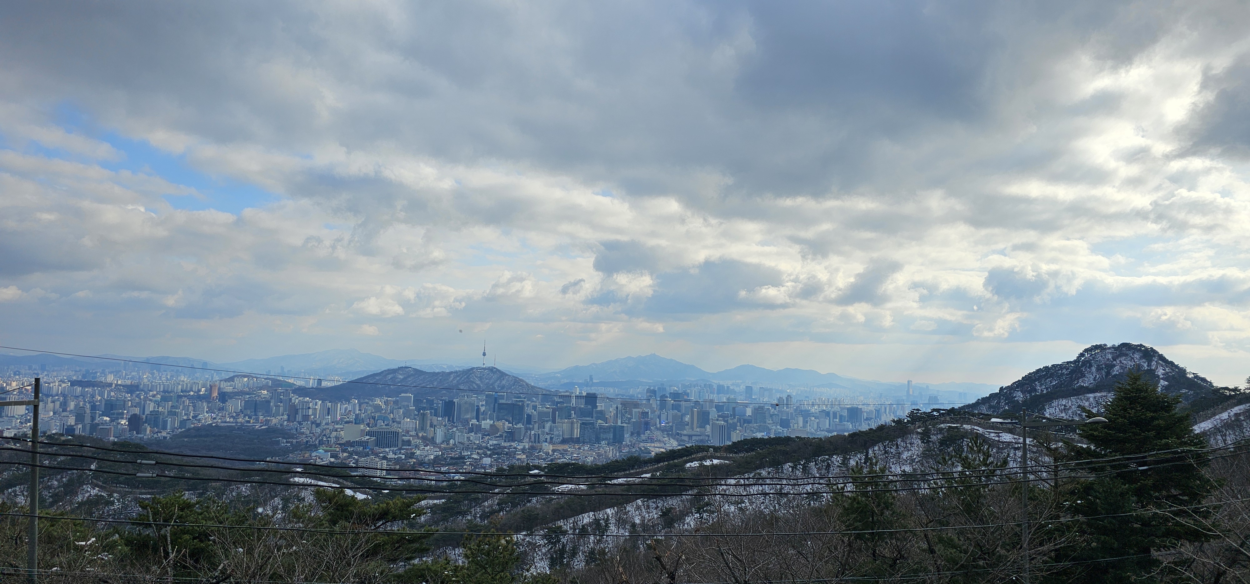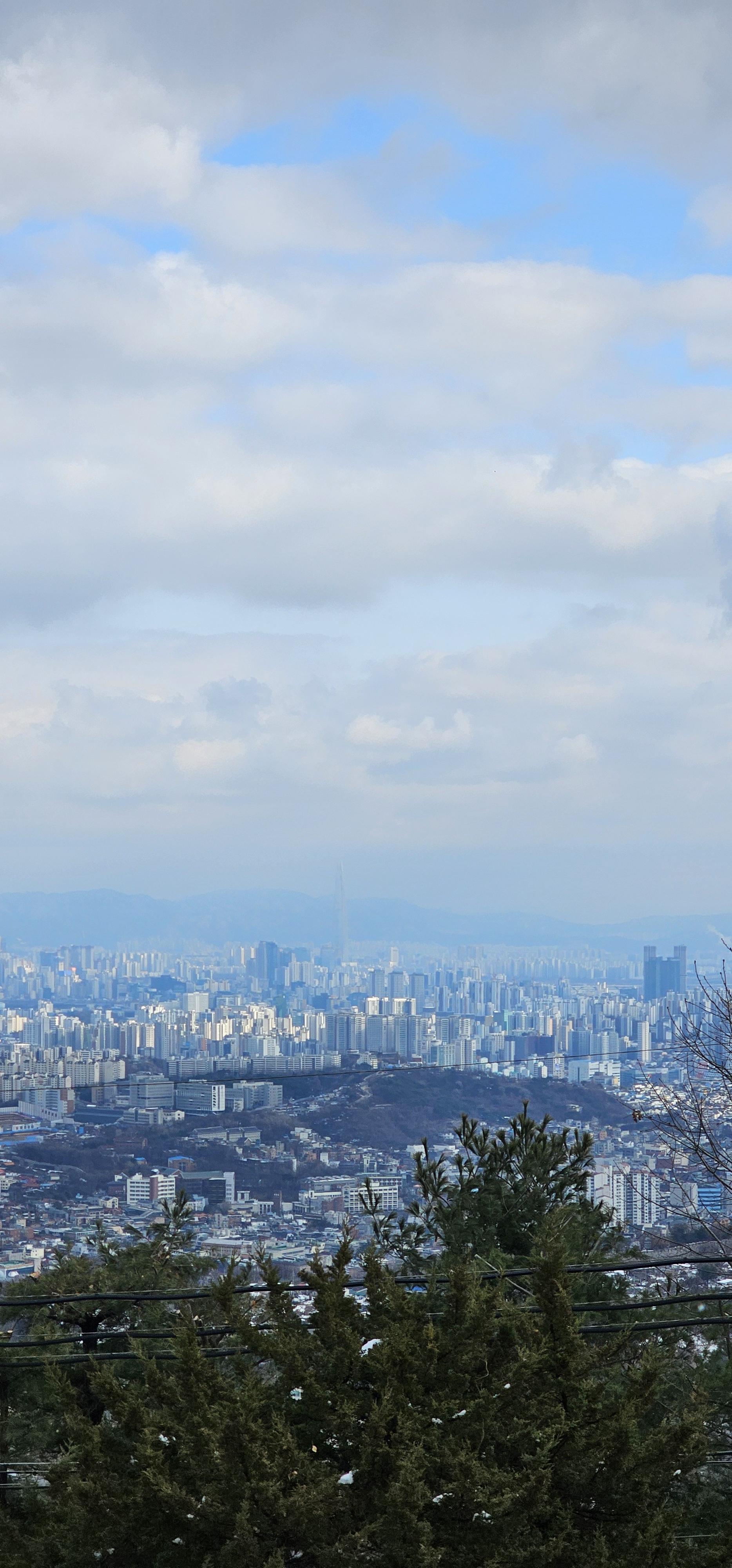 북한산이 눈으로 살짝살짝 덮여 있어 더 운치있게 느껴졌다. 반대편을 보니 구름 사이로 흐릿하게 잠실에 있는 롯데몰이 보였고 남산타워가 비교적 또렷히 보였다.