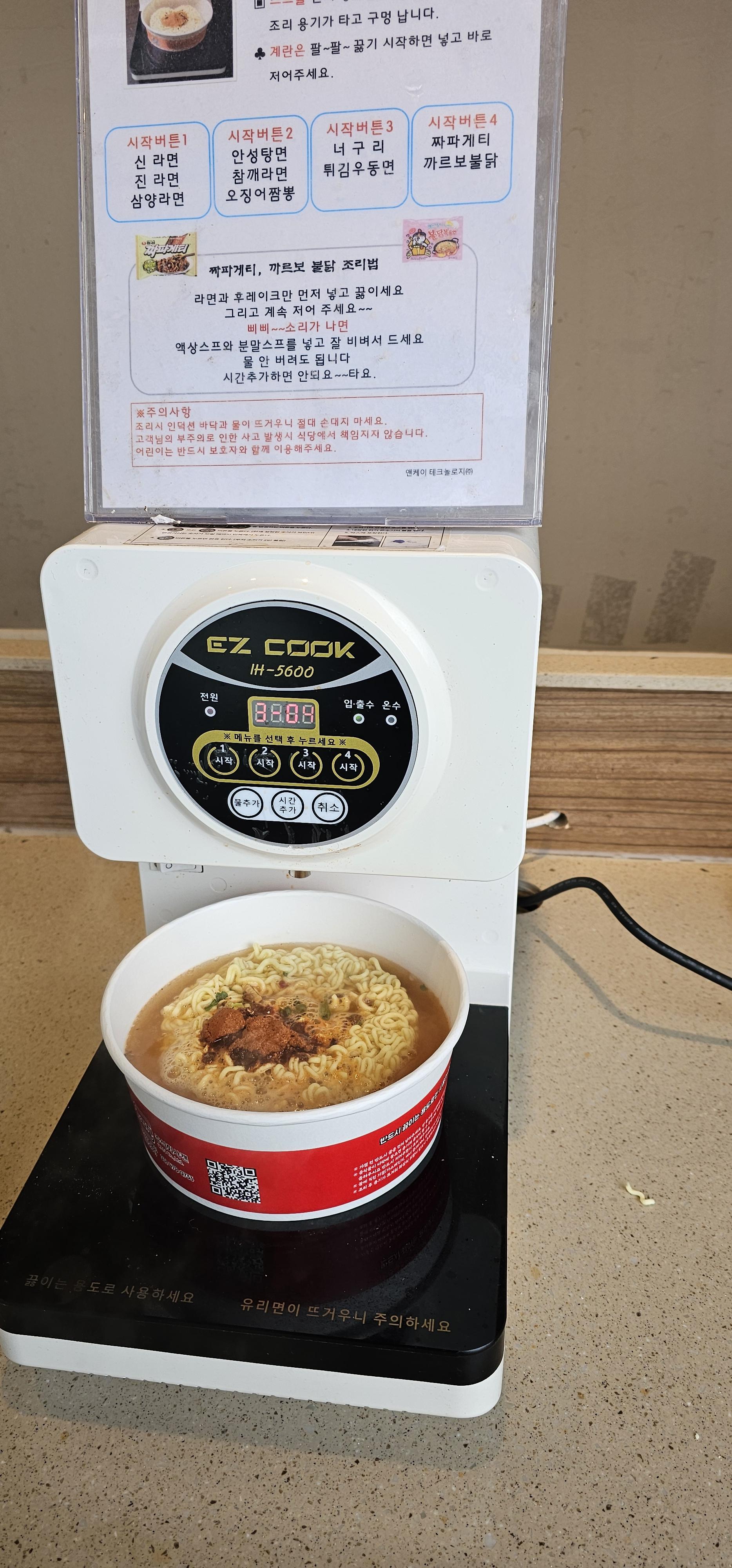 이것 저것 눌러보았는데도 안되어서 포기하고 갈려는 찰나에 옆에서 라면 끓이시는 분이 편의점에서 라면을 살 수 있다고 알려 주셨다. 얼른 편의점으로 가서 라면을 사서 끓여먹었다. 배고픈 상태에서 먹으니 너무 맛있네....